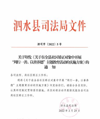 为贯彻《中华人民共和国社区矫正法》,提高教育矫正质量,推进“文化矫正”,泗水县司法局坚持“育德立人”,大胆创新,在全县社区矫正对象中开展了“周行一善,以善养德”主题教育活动。