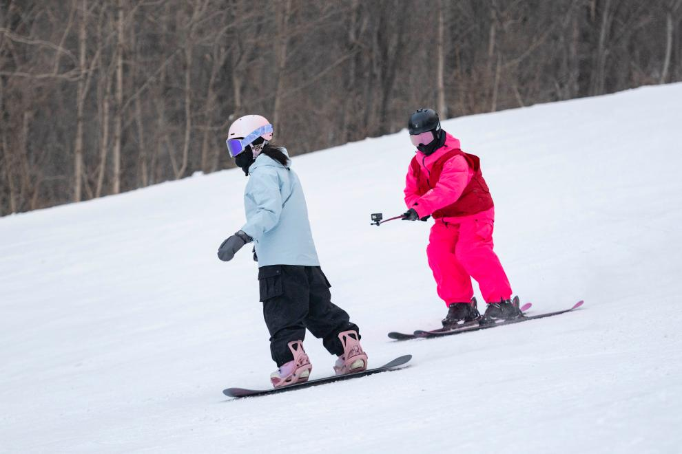 1月14日,滑雪摄影师单宝源(右)在游客滑雪时跟拍。新华社记者谢剑飞 摄