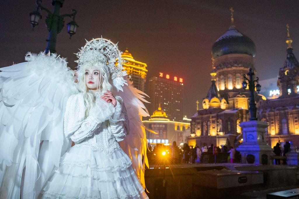 1月23日,在哈尔滨市地标建筑索菲亚教堂附近,游客身着盛装拍摄写真。新华社记者谢剑飞 摄